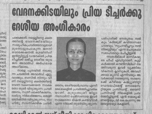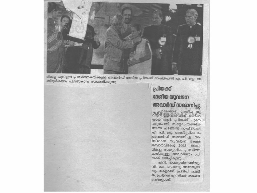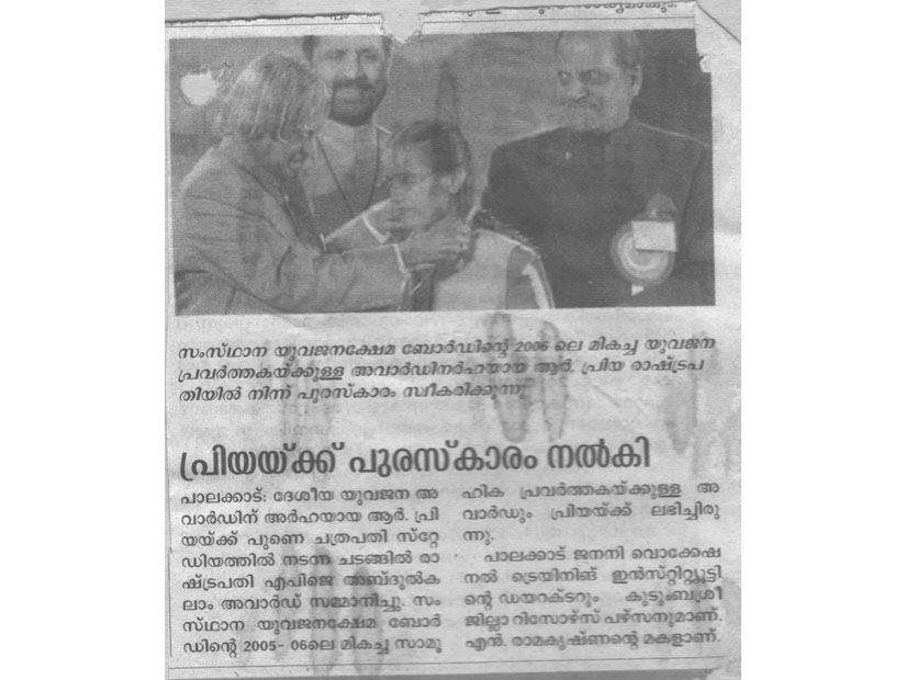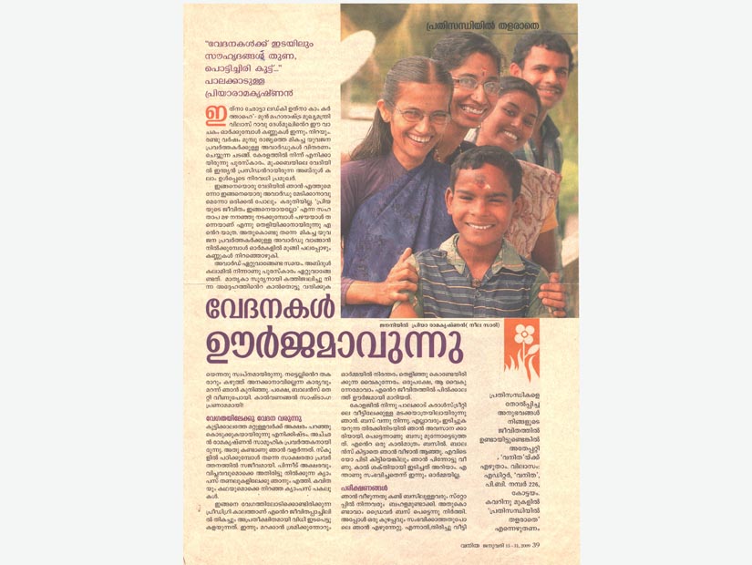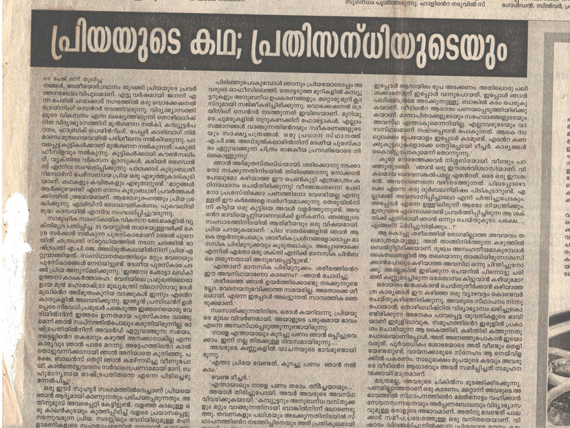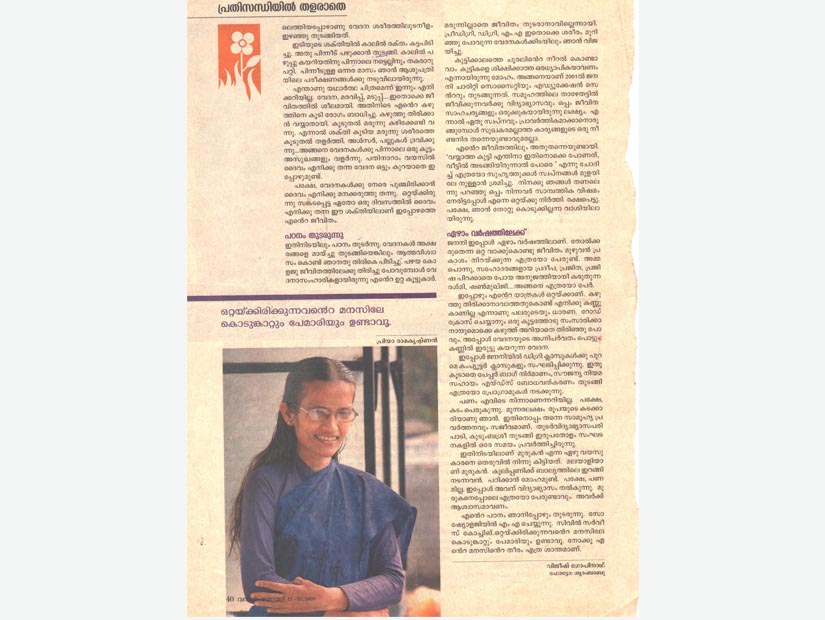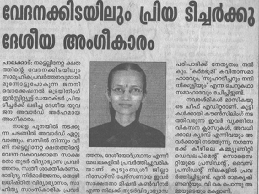 Priya was born and raised at Palakkad. In the year 1993, while pursuing her pre-degree, Priya met with an accident. She was trying to get into a bus when it sped off leaving Priya on the road with a lifelong injury. She was diagnosed with a loco motor disability. Priya was bed-ridden for months and was unable to move out of the bed. Those who came to visit her had words of sympathy which angered her more.